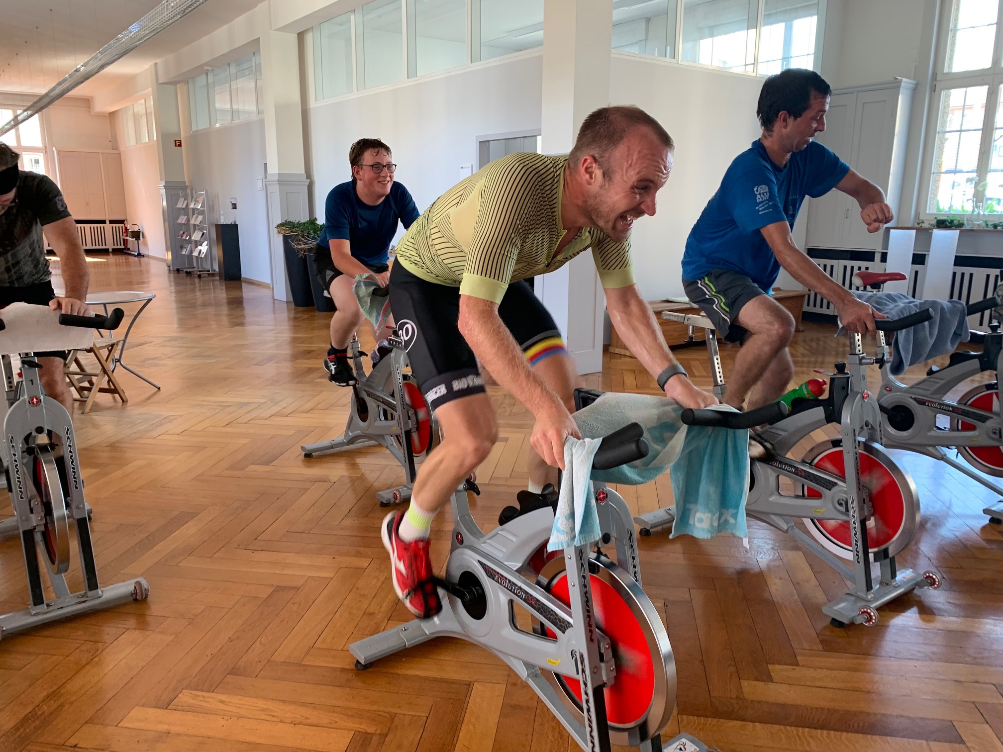 Ein neues Gesicht bereichert unsere Gruppe: Jakob, lernender Logistikpraktiker, hat sich zum Mitmachen entschieden. Vorausgegangen waren mehrere Gespräche, auch mit seiner Mama, die ihn fördert, und mit seinem Ausbildner bei Brüggli, der ihn gewissenhaft unterstützt. Jakob war vor zwei Tagen zum ersten Mal im Vitaltraining dabei, und jetzt zeigt er auch im Spinning, dass ihm an der Teilnahme liegt. Herzlich willkommen, Jakob, wir freuen uns sehr, dass Du auf die Velotour mitkommst und Dich mit uns vorbereitest.