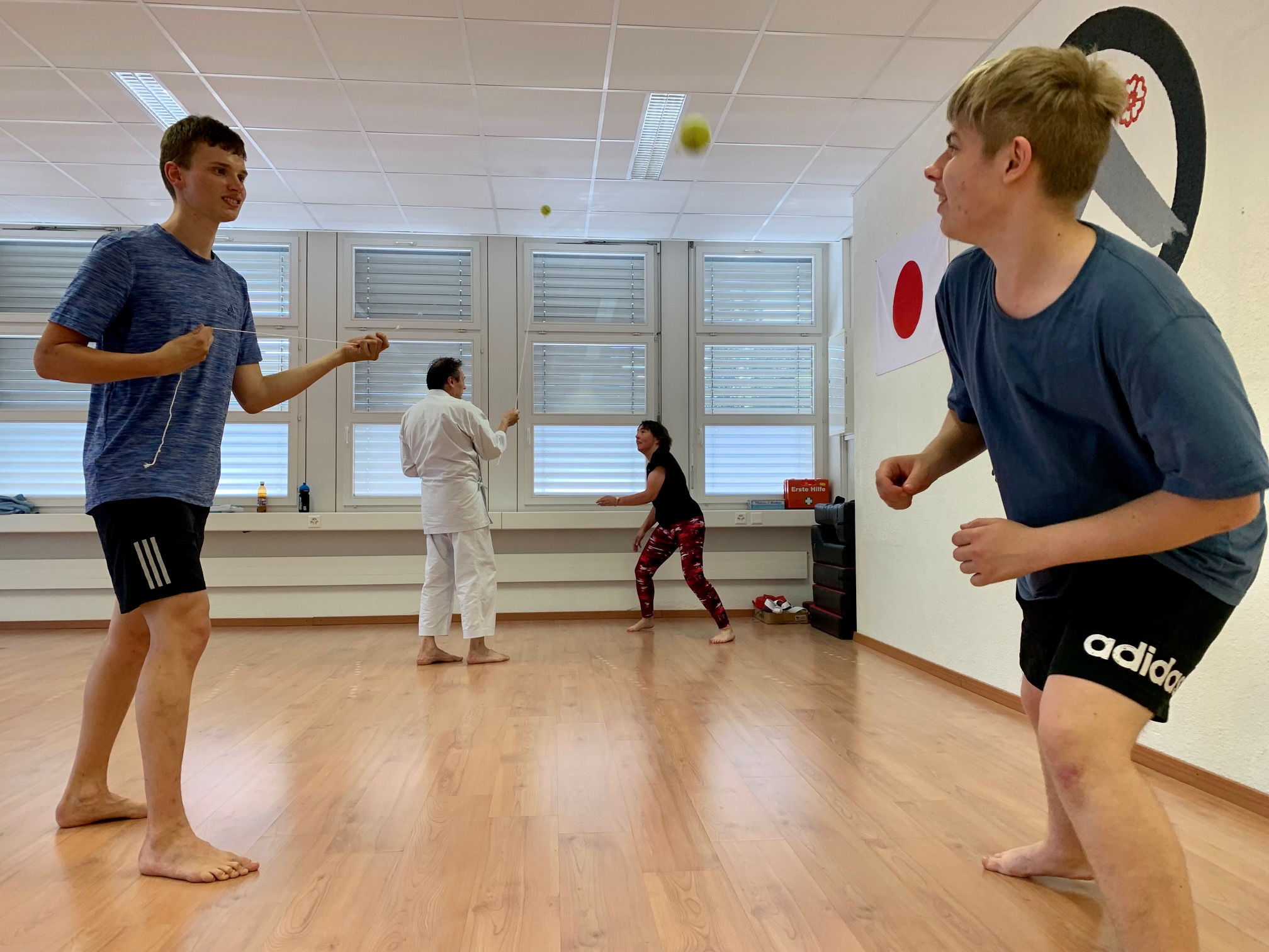 Der Tennisball kommt geflogen, aus kürzester Distanz, schnell. Er hängt an einer Schnur und wird losgeschleudert wieder und wieder. Ausweichen, wegdrehen, zur Seite weichen ist nötig, um nicht getroffen zu werden an Kopf, Hals, Schulter, Oberkörper oder Beinen. Das Blickfeld muss auf Wesentliches eingegrenzt werden; zugleich gilt es die Kolleginnen und Kollegen im Auge zu behalten, die jeweils zu zweit die selbe Übung machen. Der Platz ist eingeschränkt; wir müssen in der Spur bleiben.
