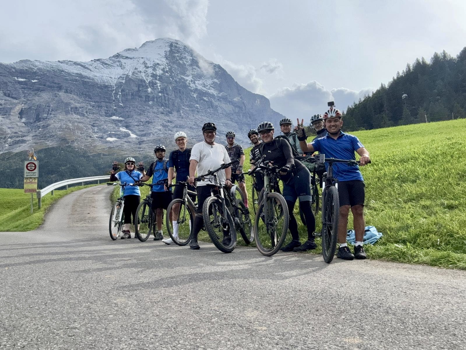 Dem Thunersee entlang folgen wir dem Lockruf der Berge. Wir erreichen Grindelwald am Fusse von Eiger, Mönch und Jungfrau, ein sehr touristisch geprägtes Bergdorf. Ehrfürchtig geht der Blick dem Berggestirn entlang Richtung Osten: Die Grosse Scheidegg, einer der schönsten Alpenübergänge, wartet auf uns. Zuerst aber geht’s nach Grindelwald-First. Wir haben Gäste, die aus Romanshorn anreisen, und mit uns einen geselligen Tag verbringen. Mit dieser Geste wollen wir auch Menschen in unser Abenteuer involvieren, die nicht fahrradfahren können. Geteilte Freude: Das Velo verbindet.