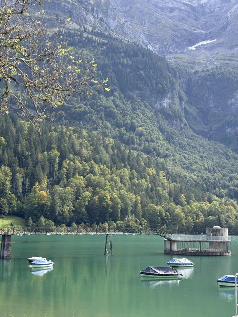 Auf 1548 m.ü.M, der Passhöhe, treffen sich alle wieder. Der Blick in die Berglandschaft ist beeindruckend und die Pause verdient. Die Abfahrt zum Klöntalersee ist ruhig und landschaftlich ein Highlight. Wir fahren durch herbstlich gefärbte Bäume, die den blaugrünen See umrunden. Auf den letzten Kilometern fahren wir eng zusammen und spüren, wie viel Unterschied ein guter Windschatten machen kann.